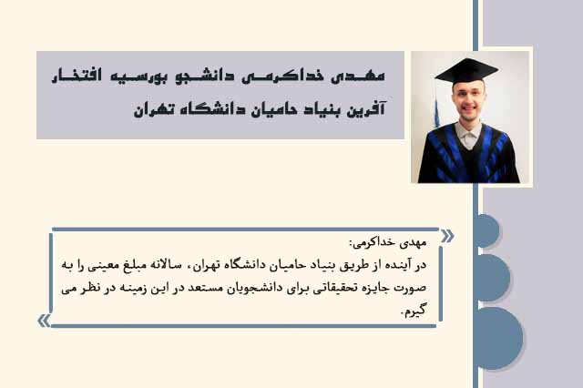 من از طریق پیگیری اخبار سایت دانشگاه تهران، اخبار بنیاد را در حوزه های مختلف دنبال میکردم و باعث افتخارم است که در پنجمین گردهمایی بنیاد حامیان دانشگاه تهران به عنوان دانشجوی افتخارآفرین انتخاب و از اینجانب تقدیر شد.
