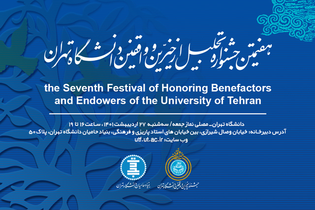 هفتمین جشنواره تجلیل از خیرین و واقفین دانشگاه تهران، با هدف ترویج فرهنگ ارزشمند وقف و نیکوکاری و تجلیل از خیرین، واقفین و نیکاندیشان دانشگاه تهران در جهت توسعه فرهنگ نیکوکاری و اعتلای دانشگاه تهران برگزار میگردد.